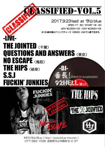 こんにちは、レディオです。 9月は滋賀でライブです。 よろしくお願いします! 9月23日(土)滋賀・守山blue CLASSIFIED vol.5 LIVE THE JOiNTED (千葉) QUESTIONS AND ANSWERS (東京) NO ESCAPE (鳥取) THE HIPS (岐阜) S.S.J FUCKIN' JUNKIES DJ 番長! (PROU…